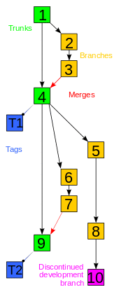 Example history graph of a revision-controlled project; trunk is in green, branches in yellow, and graph is not a tree due to presence of merges (the red arrows).