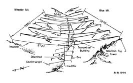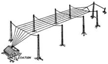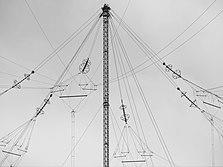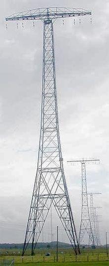 High power transmitting antennas for VLF frequencies are very large wire antennas, up to several kilometers long.[7](pp 3.9–3.21)[6](pp 24.8–24.12) They consist of a series of steel radio masts, linked at the top with a network of cables, often shaped like an umbrella or clotheslines. Either the towers themselves or vertical wires serve as monopole radiators, and the horizontal cables form a capacitive top-load to increase the current in the vertical wires, increasing the radiated power and efficiency of the antenna. High power stations use variations on the umbrella antenna such as the "delta" and "trideco" antennas, or multiwire flattop (triatic) antennas.[8] For low-power transmitters, inverted-L and T antennas are used.