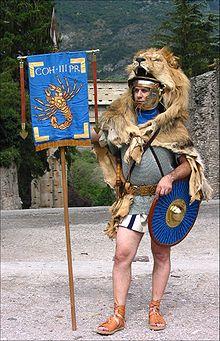The vexillarius' uniform consisted of standard Roman armor and a helmet. In place of the customary crest, the top of the helmet is decorated with lion fur.