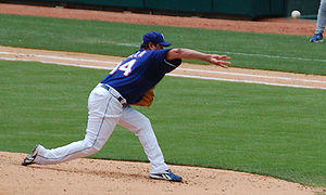 Padilla has a wide variety of pitches: a fastball, a curveball, a sinker, a slider, a changeup, and an eephus pitch.[15] The fastball is his main pitch: it tends to reach speeds of about 92-94 mph. However, he is also one of the few pitchers in baseball to throw an eephus pitch, a slow curve that travels about 55 mph. Padilla rarely throws this pitch consecutively, though.[16] He has never led his league in walks, but tends to hit a lot of batters: his total of 106 hit batters (HB) is tied for 67th all-time,[17] and he led the American League in hit batters in 2006.[18]