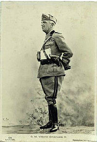 Victor Emmanuel was disgusted by what he regarded as the superficiality and frivolity of what he called the "so-called elegant society" of Rome, and as such, the king preferred to spend his time out in the countryside where he went hunting, fishing and reading military history books outside.[25] A taciturn man who felt deeply uncomfortable expressing himself in conversation, Victor Emmanuel was content to let Mussolini rule Italy as he regarded Il Duce as a "strong man" who saved him the trouble from meeting various politicians as he had done before 1922.[26]