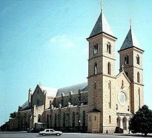 The Basilica of St. Fidelis, known as "The Cathedral of the Plains", is located in Victoria. Local Roman Catholic residents, having outgrown a series of church buildings as their population grew, began construction of the church in 1908.[10] Built from native limestone based on plans by noted church architect John T. Comes, St. Fidelis Catholic Church was completed in 1911.[10][24] William Jennings Bryan gave the church its nickname during a visit in 1912.[25] In June 2014, the Roman Catholic Diocese of Salina dedicated the church as a minor basilica, renaming it the Basilica of St. Fidelis.[26]