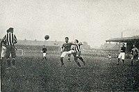 The Victoria Ground had been Stoke City's home since March 1878 and the first match was a friendly against Talke Rangers on 28 March 1878, Stoke won 1–0 before 2,500 spectators.[2] The ground took its name from the nearby Victoria Hotel and was originally an oval shape, built to accommodate a running track and used by the local athletic club.[2] There was an open grass bank at each end, and a small but compact wooden stand on the east side (Boothen Road) capable of housing 1,000 people.[2] Opposite this stand was another bank which could hold 4,000. The ground remained this way for 30 years during which time Stoke had become members of the Football League.[2] The first league match at the Victoria Ground was on 8 September 1888 and ended in a 2–0 defeat against West Bromwich Albion.[2] Stoke suffered financial difficulties and dropped out of the league in 1908 and attendances varied during their time out.[2] Stoke got back into the league in 1919 and the ground had now been improved considerably. There were two good sized grandstands and an extra wooden one which was situated opposite the main stand and could hold 1,000 supporters.[2]