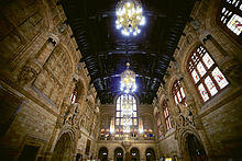 The interior, including the Great Hall, is faced with sandy-yellow terracotta and intricate ornamentation. The terracotta used for the interior was produced by Gibbs and Canning Limited of Tamworth.[3]