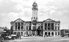 In 1901, it was decided that a public hall would be built in memory of Queen Victoria who died that year. Public funds for its construction amounting to $368,000 were collected, exceeding the construction costs, thus leaving a surplus of $22,000 for the renovation of the town hall so that it blended in with the new hall.[6] The foundation stone was laid on the occasion of King Edward VII's coronation celebration on 10 August 1902, and the new building was built between 1903 and 1905 next to the Town Hall.