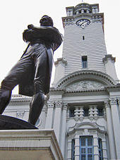 The construction of the signature clock tower was delayed due to delays in the donation of the clock and chimes by the Straits Trading Company. The clock, four metres wide, weighs 1 tonne and cost $6,000.[5] Its dial faces look in four directions, and there is a bell turret above it, capped by a cupola.[7]