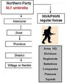 During the Second Indochina War, better known as the Vietnam War, a distinctive land warfare strategy and organization was used by the National Liberation Front of South Vietnam (NLF) or better known as the Viet Cong (VC) in the West, and the People's Army of Vietnam (PAVN) or North Vietnamese Army (NVA) to defeat their American and South Vietnamese Army of the Republic of Vietnam (ARVN) opponents. These methods involved closely integrated political and military strategy – what was called dau tranh. The National Liberation Front, (NLF) was an umbrella of front groups, sympathizers and allies set up by the rulers of North Vietnam to conduct the insurgency in South Vietnam. The NLF also included fully armed formations- regional and local guerrillas, and the People's Liberation Armed Forces (PLAF). The PLAF was the "Main Force" – the Chu Luc or full-time soldiers of the NLF's military wing. Many histories lump both the NLF and the armed formations under the term "Viet Cong" or "VC" in common usage. Both were tightly interwoven and were in turn controlled by the North.[1] Others consider the Viet Cong or "VC" to primarily refer to the armed elements.[2] The term PAVN (People's Army of Vietnam), identifies regular troops of the North Vietnamese Army or NVA as they were commonly known by their Western opponents. Collectively, both forces- the southern armed wing and the regulars from the north were part of PAVN.[3]