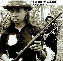 Of special note are the paramilitary units- the Popular Forces and Regional Forces (RF/PF – aka "Ruff-Puffs").[34] These militia troops were locally or regionally based, and continually shortchanged in terms of equipment, weaponry, pay, leadership, supplies and combat support like air, artillery or gunship strikes. Knowing their local areas in detail they had significant potential for local population security and represented a constant threat to communist troop movements and the Viet Cong Infrastructure (also known as the Revolutionary Infrastructure).[35] As such they came under special attack, suffering a higher casualty rate than ARVN regulars. Overlooked by both the US Army and their ARVN leaders, they made a credible impact- using less than 20% of the ARVN military budget and just 2–5% of overall war expenditure, the despised militia men accounted for some 30 percent of NLF/PAVN combat deaths inflicted by the South Vietnamese combat effort, despite lacking the heavy weaponry and resources of the regular army. Serious efforts to arm and train them properly however came comparatively late in the conflict (after the Tet Offensive) and their efforts however were often sidetracked by the American and ARVN preference for big-unit sweeps. They were never really integrated into the total war effort.[36]