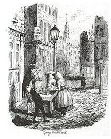 Aside from journalism, vignettes in the form of the “literary sketch” became popularised in the Victorian era by authors such as William Makepeace Thackeray and Charles Dickens, and their works would often appear in newspapers and magazines.[6] Works such as Sketches by Boz by Charles Dickens, and Thackeray’s Vanity Fair: Pen and Pencil Sketches of English Society, drew heavily from the original definition of a sketch in the visual arts by creating a sense of spontaneity, freedom and authenticity.[6] These sketches sometimes included visual illustrations by George Cruikshank, and were viewed as rough drafts rather than complete works of literature - a necessary step towards creating a finished work, but not inferior to a finished work.[6] The fragmentary and immediate style of these vignettes reflected the 19th century’s sense of economic and social instability, and the rapid pace of urban life.[6]