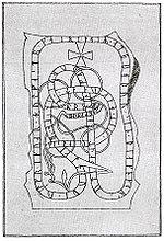 This runestone is found at Spånga and it sports not only long-branch runes, but also cipher runes made of both short-twig runes and staveless runes. The ornamentation is a ship where the mast is an artful cross. It is the only runestone with both text and iconography that refer to a ship.[21] It was raised in memory of a man who took part in an expedition to the west where he was buried, and refers to him heroically in alliterative verse or prose.[21] This runestone is attributed to a runemaster named Traen.[22]