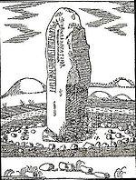 There is a depiction of the cross-less stone from the 17th century, made by Johan Hadorph and Johan Peringskiöld.[23] This depiction has helped scholars reconstruct the parts that are damaged today.[23] The runestone was raised anew by Richard Dybeck in 1864.[23] In 1936, Ivar Schnell examined the stone, and he noted that there was a large stone next to it.[23] When this stone was raised, they discovered that it was also a runestone, and it was probably the one that had been previously described by Lukas Gadd as the "square stone".[23] In the vicinity, Schnell found a destroyed stone without runes which probably was the leaning stone described by Gadd.[23] Since they would hinder agriculture, the three stones were re-erected at a distance of 60 metres, at the side of the road.[23] The stone circle and the other monuments described by Gadd could not be found anymore.[23]