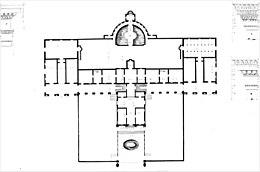 At Maser, the patron and the architect agreed on a centralised building closely following classical models. In some other church commissions such as the Redentore (which is a related design to the Tempietto), Palladio had been obliged to go against his inclinations and provide a long nave, but at Maser he had a patron who preferred a centralised plan. The connection of a temple front to a domed building refers to the Pantheon. A portico that is drawn out a long way, and has unusually steep proportions, leads along with the diagonal parts of the pediment to two small bell towers, which for their part pass on the upward-moving trend to the dome. The five spaces between the columns are framed by pillars, which are like the middle four columns in their entasis and tapering. The facade probably faced on to a small square originally.