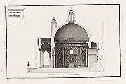 The interior has stucco decorations attributed to Alessandro Vittoria. An entablature is finished with a rich decoration of cherubs and tendrils and creates a transition to the dome vault, along with a balustrade. Palladio alternates deep niches on a rectangular ground-plan and closed wall areas with figure tabernacles between the eight regular half-columns. The lower part of the building is completed by an unbroken continuous ledge, whose profile – three flat bands which are contrasted with each other by ovolo moulding – is taken over from the arcade arches. The architect contrasts two forms of cylinder and semi-sphere by a repeated emphasis on horizontals, and, over and above that, divides them into a palpable terrestrial zone and into a light, celestial one that cannot be precisely gauged with the eye.