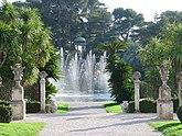 The garden à la française is the largest and occupies the area behind the villa. Next to the villa there is a terrace with a formal French garden and topiaries. Beyond the terrace is a park with palm trees and a long basin, ornamented with fountains, statues, and basins with water lilies and other aquatic plants. On the far end of the park is a hill covered with cypress trees, surrounding a replica garden of the Temple of Love at the Petit Trianon palace in Versailles. The slope below the temple has a cascade of water in the form of a stairway, which feeds into the large basin.