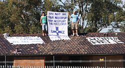 The site of the Detention Centre was previously known as the Villawood Migrant Hostel, built in 1949 to house migrants from post-war Europe to work in local industries.[3] The centre was run by Commonwealth Hostels Ltd, a non-profit company. By 1964 the centre housed 1,425 people, mainly from Britain and Europe.[4] By 1969 it was the largest migrant hostel in Australia, and was at that time housing migrants from Britain, The Netherlands, Denmark, West Germany, France, Czechoslovakia, Yugoslavia and Turkey.[5] In 1968 the centre was divided into two sections, one named the Villawood Migrant Hostel and the other named the Westbridge Migrant Hostel, which operated until 1984.[4]