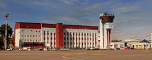 The construction of the airport building started in 1949 and completed in 1954.[4] It features a standard 1950s Soviet airport terminal design, originally intended for an airport with up to 20 aircraft movements per day. On the outside, it is decorated with sculptures of soldiers, workers and aviators, while inside walls and ceilings feature wreaths, bay leaves and stars, and until the early 1990s, the Soviet hammer and sickle, typical decor for Soviet public buildings of early post-war years.
