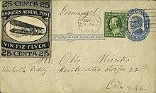 In addition to the Vin Fiz endorsement, Mabel Rodgers used the flight to promote an airmail service, and sold special 25-cent postage stamps for items to be carried on the airplane. They were semi-official - the Post Office tolerated them, but insisted that mail carry regular stamps as well. The stamps were large, inscribed "RODGERS AERIAL POST" and "VIN FIZ FLYER", with a picture of the airplane in the center. It is believed that they were ordered by Cal's brother, Robert S. Rodgers, from a printer in Kansas City, Missouri, and they were probably first available around October 14.