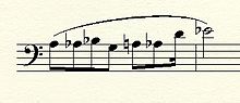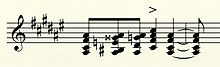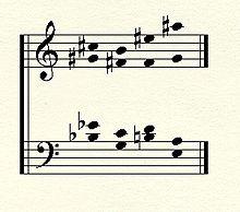 For example, Messiaen has written that "The 'Theme of Chords' is heard throughout, fragmented, concentrated, surrounded with resonances, combined with itself, modified in both rhythm and register, transformed, transmuted in all sorts of ways: it is a complex of sounds intended for perpetual variation, pre-existing in the abstract like a series, but quite concrete and quite easily recognizable through its colours: a steely grey-blue shot through with red and bright orange, a mauve violet spotted with leather-brown and encircled by bluish-purple."[1]