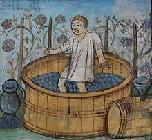 Pigeage is a French term for the management of acidity and secondary pressing of grapes in fermentation tanks. To make certain types of wine, grapes are put through a crusher and then poured into open fermentation tanks. Once fermentation begins, the grape skins are pushed to the surface by carbon dioxide gases released in the fermentation process. This layer of skins and other solids is known as the cap. As the skins are the source of the tannins, the cap needs to be mixed through the liquid each day, or "punched," which traditionally is done by stomping through the vat.