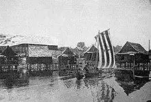 The vinta is a traditional outrigger boat from the Philippine island of Mindanao. The boats are made by Sama-Bajau, Tausug and Yakan peoples living in the Sulu Archipelago,[2] Zamboanga peninsula, and southern Mindanao. Vinta are characterized by their colorful rectangular lug sails (bukay) and bifurcated prows and sterns, which resemble the gaping mouth of a crocodile. Vinta are used as fishing vessels, cargo ships, and houseboats. Smaller undecorated versions of the vinta used for fishing are known as tondaan.[3]