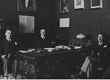 Madgearu was initially supportive of King Carol II, whom his party had helped bring to power, and remained sympathetic despite the confrontation between the monarch and the PNȚ leader Iuliu Maniu.[3] According to the ironic account given by Petre Pandrea, the connection was tested by intrigue, after the writers Sergiu Dan and Ion Vinea allegedly stole a text by Madgearu (which was supposed to be published in Dreptatea), forged it by adding statements critical of Carol's policies, and sold it to Madgearu's main adversary inside the party, Mihail Manoilescu (Carol himself dismissed the letter as a fake, contributing to the ultimate PNȚ inner-conflict that caused Manoilescu to leave the group).[3]