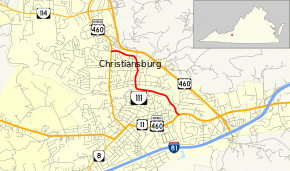 State Route 111 (SR 111) is a primary state highway in the U.S. state of Virginia. The state highway runs 2.26 miles (3.64 km) from U.S. Route 460 Business (US 460 Business) east to US 11 and US 460 Business within Christiansburg.