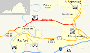 State Route 114 is a primary state highway in the U.S. state of Virginia. Known as Peppers Ferry Road, the state highway runs 10.32 miles (16.61 km) from U.S. Route 11 (US 11) in Fairlawn east to US 460 in Christiansburg. SR 114 is the northernmost of three east–west highways between Radford and Christiansburg and the most direct highway between Radford and Blacksburg. The state highway also connects those cities with the Radford Army Ammunition Plant.