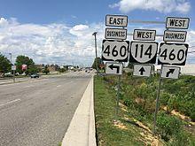 SR 114 continues east as a two-lane road on a single carriageway that passes through farmland to the south of Price Mountain on its way to the town of Christiansburg. The state highway intersects the Huckleberry Trail, a rail trail, to the south of the New River Valley Mall before intersecting US 460 Business (Franklin Street). There, SR 114 expands to a six-lane divided highway that passes through a commercial area between the business route and the partial cloverleaf interchange with US 460 that serves as the highway's eastern terminus. Peppers Ferry Road continues east as a divided highway for a short distance beyond the easternmost ramps of the interchange before curving north as two-lane Cinnabar Road, which serves as a frontage road for US 460.[2][3]