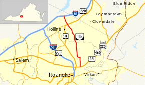 State Route 115 (SR 115) is a primary state highway in the U.S. state of Virginia. Known for most of its length as Plantation Road, the state highway runs 6.00 miles (9.66 km) from U.S. Route 221, US 460, and US 220 Alternate in Roanoke north to Interstate 81 and US 220 near Hollins.