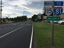 SR 115 begins at an intersection with Orange Avenue, which carries US 221, US 460, and US 220 Alternate, in the northeastern part of the city of Roanoke. The state highway heads north as two-lane Hollins Road between an industrial area that lines Norfolk Southern Railway's Roanoke District to the west and a residential area to the east. SR 115 turns west onto Liberty Road to pass under the railroad, then turns north onto Plantation Road. The state highway leaves the city of Roanoke and enters Roanoke County by crossing Carvin Creek, a tributary of Tinker Creek, south of its intersection with SR 625 (Hershberger Road), which becomes SR 101 to the west. SR 115 continues through the community of Hollins, where the highway intersects US 11 (Lee Highway). The state highway expands to a five-lane road with center turn lane and passes through an industrial area on its way to its northern terminus at a diamond interchange with I-81 and US 220. Immediately north of the interchange, Plantation Road continues as SR 815, which turns east to parallel the Interstate before turning north to its end at the dam that impounds Carvin Creek to form Carvin Cove Reservoir just north of the Roanoke–Botetourt county line.[1][2]