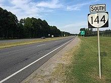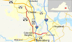 State Route 144 (SR 144) is a primary state highway in the U.S. state of Virginia. The state highway runs 13.97 miles (22.48 km) from SR 36 at Fort Lee north to SR 145 at Centralia. SR 144's east–west segment is the main highway between Colonial Heights and both Fort Lee and Hopewell. The state highway's north–south section connects U.S. Route 1 (US 1) and US 301 in Colonial Heights with SR 10 in Chester. It was first added to the state highway system in 1930 as State Route 425 (SR 425) and had gained its current routing and designation by 1987.