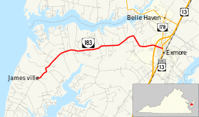 SR 183 begins at an intersection with SR 613 and SR 709 in Jamesville. Occohannock Neck Road continues south along SR 613 to Silver Beach. The state highway heads northeast and east as a two-lane undivided road along the spine of Occohannock Neck, which lies between the Chesapeake Bay to the west and Nassawadox Creek to the south and east. SR 183 passes through the hamlet of Wardtown and has a pair of sharp curves before entering the town of Exmore just west of its intersection with US 13 (Lankford Highway). The state highway reaches its eastern terminus at US 13 Business (Main Street) in the center of the town, two blocks south of the southern terminus of SR 178.[1][2]