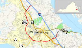 State Route 199 (SR 199) is a primary state highway in the U.S. state of Virginia. Known for most of its length as Humelsine Parkway, the state highway runs 14.13 miles (22.74 km) from Interstate 64 (I-64) and SR 646 in Lightfoot to SR 641 near Williamsburg. VA 199 forms a western loop of Williamsburg in York and James City Counties. The state highway, which is entirely a four-lane limited-access highway with a mix of intersections and interchanges, provides access from I-64 to several highways that serve attractions around Williamsburg, including U.S. Route 60 (US 60) and Colonial Parkway, an automobile parkway that leads to Colonial Williamsburg, Jamestown, and Yorktown. VA 199 between its junctions with I-64 is named for Carlisle H. Humelsine, a former curator and president of Colonial Williamsburg, in 2004.[3]