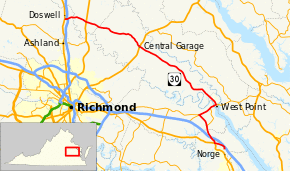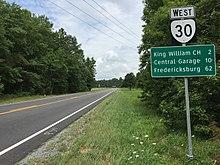 State Route 30 (SR 30) is a primary state highway in the U.S. state of Virginia. The state highway runs 61.87 miles (99.57 km) from U.S. Route 1 (US 1) in Doswell east to Interstate 64 (I-64) and SR 607 near Norge. SR 30 runs east–west through Hanover and Caroline Counties, connecting US 1 and I-95 with Kings Dominion and US 301. The state highway serves as the principal highway of King William County, connecting U.S. Route 360 with SR 33 in West Point via the county's namesake county seat. SR 30 also connects SR 33 and US 60 in New Kent and James City Counties.