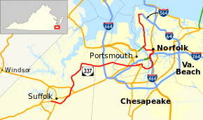 SR 337 begins at U.S. Route 58 Business west of downtown Suffolk and ends at the north end of Interstate 564 at Naval Station Norfolk.[5] It uses a number of different streets to get there. Through downtown Suffolk, SR 337 is Washington Street. This becomes Nansemond Parkway after crossing US 58 Bus. at Magnolia,[1] and becomes Portsmouth Boulevard as it enters Chesapeake.[2] The name remains after it enters Portsmouth via the Hodges Ferry Bridge, including a short concurrency with US 460 Alt. between US 58 and I-264, until the Elm Avenue intersection. There SR 337 turns south on Elm Avenue, which turns east to reach the Jordan Bridge.[3] At the Jordan Bridge, SR 337 again enters Chesapeake, heading east on Poindexter Street across I-464 and north on Bainbridge Boulevard. (US 460 and SR 166 use the other two legs of the Poindexter-Bainbridge intersection.)[2]
