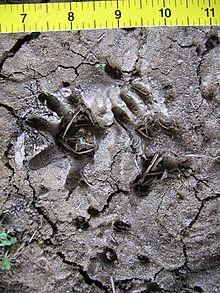 Virginia opossum tracks generally show five finger-like toes in both the fore and hind prints.[17] The hind tracks are unusual and distinctive due to the opossum's opposable thumb, which generally prints at an angle of 90° or greater to the other fingers (sometimes near 180°). Individual adult tracks generally measure 1.9 in long by 2.0 in wide (4.8 × 5.1 cm) for the fore prints and 2.5 in long by 2.3 in wide (6.4 × 5.7 cm) for the hind prints. Opossums have claws on all fingers fore and hind except on the two thumbs (in the photograph, claw marks show as small holes just beyond the tip of each finger); these generally show in the tracks. In a soft medium, such as the mud in this photograph, the foot pads clearly show (these are the deep, darker areas where the fingers and toes meet the rest of the hand or foot, which have been filled with plant debris by wind due to the advanced age of the tracks).