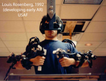 Virtual Fixtures was first developed by Louis Rosenberg in 1992 at the USAF Armstrong Labs, resulting in the first immersive augmented reality system ever built.[1][2][3][4][5] Because 3D graphics were too slow in the early 1990s to present a photorealistic and spatially-registered augmented reality, Virtual Fixtures used two real physical robots, controlled by a full upper-body exoskeleton worn by the user. To create the immersive experience for the user, a unique optics configuration was employed that involved a pair of binocular magnifiers aligned so that the user's view of the robot arms were brought forward so as to appear registered in the exact location of the user's real physical arms.[1][6][4] The result was a spatially-registered immersive experience in which the user moved his or her arms, while seeing robot arms in the place where his or her arms should be. The system also employed computer-generated virtual overlays in the form of simulated physical barriers, fields, and guides, designed to assist in the user while performing real physical tasks.[7][2]
