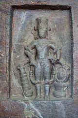 Several hymns of the Rigveda repeat the mighty deed of Vishnu called the Trivikrama, which is one of the lasting mythologies in Hinduism since the Vedic times.[62] It is an inspiration for ancient artwork in numerous Hindu temples such as at the Ellora Caves, which depict the Trivikrama legend through the Vamana avatar of Vishnu.[63][64] Trivikrama refers to the celebrated three steps or "three strides" of Vishnu. Starting as a small insignificant looking being, Vishnu undertakes a herculean task of establishing his reach and form, then with his first step covers the earth, with second the ether, and the third entire heaven.[62][65]