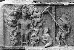The literary sources mentions that Vishvarupa has "multiple" or "thousand/hundred" (numeric equivalent of conveying infinite in literary sources) heads and arms, but do not give a specific number of body parts that can be depicted.[16] Early Gupta and post-Gupta sculptors were faced with difficulty of portraying infiniteness and multiple body parts in a feasible way.[17] Arjuna's description of Vishvarupa gave iconographers two options: Vishvarupa as a multi-headed and multi-armed god or all components of the universe displayed in the body of the deity.[18] Early Vishvarupa chose the former, while Buddhist images of a Cosmic Buddha were displayed in the latter format. An icon, discovered in Parel, Mumbai dated to c. 600, has seven figures all appearing interlinked to each other. Though the icon mirrors the Vishvarupa of Vishnu, it is actually a rare image of the Vishvarupa of Shiva.[18]