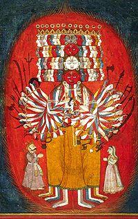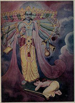 In modern calendar art, Vishvarupa is depicted having many heads, each a different aspect of the divine. Some of the heads breathe fire indicating destructive aspects of God. Many deities are seen on his various body parts. His many hands hold various weapons. Often Arjuna features in this scene bowing to Vishvarupa.[26]