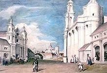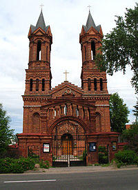 Churches from the Polish-Lithuanian period were likewise destroyed, although the Resurrection Church (1772–77) has been rebuilt. The Orthodox cathedral, dedicated to the Intercession of the Theotokos, was erected in 1760. There are also the town hall (1775); the Russian governor's palace, where Napoleon celebrated his 43rd birthday in 1812; the Neo-Romanesque Roman Catholic cathedral (1884–85); and an obelisk commemorating the centenary of the Russian victory over Napoleon.
