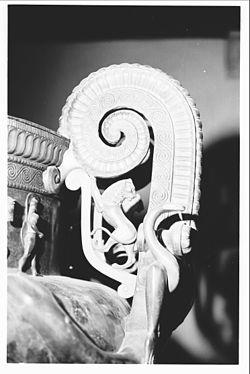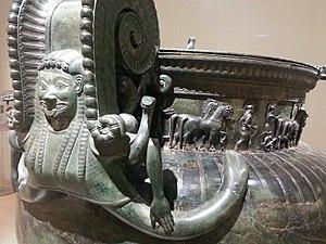 - The three handles, supported by rampant lionesses, weighed about 46 kg each. Each is a 55 cm high volute, each is elaborately decorated with a grimacing gorgon, a common motif on contemporary Greek bronzes.