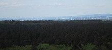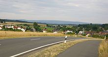 The Vogelsberg is the largest contiguous volcanic region in Central Europe with an area of 2,500 square kilometres.[2] It is not a former shield volcano, but comprises many individual volcanoes, which are superimposed. Thus it consists of a multitude of overlapping basalt terraces, which descend from the Oberwald, the high central plateau, 600 to 773 metres high, in series of stepped rings to the edges of the mountain region. Its present appearance, which is reminiscent of a large flat, shield-shaped volcano with a central dome, is the result of an interplay of uplift processes and ablation acting on all sides.