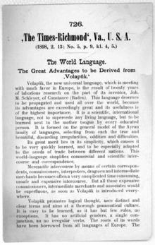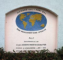 Volapük (/ˈvɒləpʊk/ in English;[2] [volaˈpyk] in Volapük) is a constructed language created between 1879 and 1880 by Johann Martin Schleyer, a Roman Catholic priest in Baden, Germany, who believed that God had told him in a dream to create an international language. Volapük conventions took place in 1884 (Friedrichshafen), 1887 (Munich) and 1889 (Paris). The first two conventions used German, and the last conference used only Volapük. In 1889, there were an estimated 283 clubs, 25 periodicals in or about Volapük, and 316 textbooks in 25 languages;[3] at that time the language claimed nearly a million adherents.[4] Volapük was largely displaced between late 19th and early 20th century by Esperanto.[5]