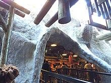 Guests entered the expedition camp set up at the base of the mountain. After passing under the entrance archway, guests navigated through a rocky trail. The viewing area of Avalanche could be seen in this section next to a cavern. Upon entering the cavern, guests approached a switchback area with tribal masks. Guests crossed a bridge that led to a hut with more switchbacks. After climbing down the staircase, guests reached the station inside the mountain, where they boarded one of the three trains.[3][4]