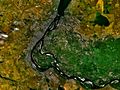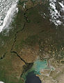 The Volga is the longest river in Europe, and its catchment area is almost entirely inside Russia, though the longest river in Russia is the Ob–Irtysh river system.[1] It belongs to the closed basin of the Caspian Sea, being the longest river to flow into a closed basin. Rising in the Valdai Hills 225 meters (738 ft) above sea level northwest of Moscow and about 320 kilometers (200 mi) southeast of Saint Petersburg, the Volga heads east past Lake Sterzh, Tver, Dubna, Rybinsk, Yaroslavl, Nizhny Novgorod, and Kazan. From there it turns south, flows past Ulyanovsk, Tolyatti, Samara, Saratov and Volgograd, and discharges into the Caspian Sea below Astrakhan at 28 meters (92 ft) below sea level.[1] At its most strategic point, it bends toward the Don ("the big bend"). Volgograd, formerly Stalingrad, is located there.