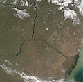 The Volga has many tributaries, most importantly the rivers Kama, the Oka, the Vetluga, and the Sura. The Volga and its tributaries form the Volga river system, which flows through an area of about 1,350,000 square kilometres (521,238 square miles) in the most heavily populated part of Russia.[1] The Volga Delta has a length of about 160 kilometres (99 miles) and includes as many as 500 channels and smaller rivers. The largest estuary in Europe, it is the only place in Russia where pelicans, flamingos, and lotuses may be found. The Volga freezes for most of its length for three months each year.[1]