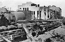 By the time war broke out in September 1939, the tractor plant had produced a quarter of a million standard tractors as well as 40,000 tracked versions. During World War II, the plant was retooled to produce military equipment and weapons for the Soviet Red Army, most notably the T-34 tank.[3] The plant became world-famous during the Battle of Stalingrad. When the German Wehrmacht reached the city in the summer of 1942, the tractor plant was their first target, and it was largely destroyed during the fierce fighting that ensued over the next few months.[1] Once the hostilities had ended with the final victory in February 1943, the site was cleared of shells and debris so that restoration work could begin immediately. Full-scale production resumed at the plant within months of the city being liberated.[3]