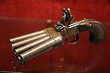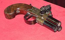 A few hand-held volley guns were also developed during the 18th and 19th centuries. One of the most distinctive was the "duck's foot" volley gun, a pistol with multiple barrels arranged in a splayed pattern, so that the firer could spray a sizable area with a single shot.[5] The principle behind this type of pistol is one of confrontation by one person against a group; hence, it was popular among bank guards, prison wardens and sea captains in the early 19th century.[6][7]