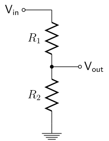 In electronics, a voltage divider (also known as a potential divider) is a passive linear circuit that produces an output voltage (Vout) that is a fraction of its input voltage (Vin). Voltage division is the result of distributing the input voltage among the components of the divider. A simple example of a voltage divider is two resistors connected in series, with the input voltage applied across the resistor pair and the output voltage emerging from the connection between them.
